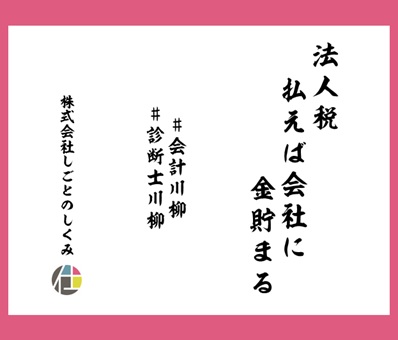 会計川柳 · 2023/03/17 法人税 払えば会社に 金貯まる 税金払うとお金が減ると思って せっせと経費を使って節税 経費を使えば当然会社のお金が減る 経費を使わずに税金払った方が 会社にお金が貯まるという真実 節税して 会社にお金なくて 借入して利息を払う という会社がなんと多いことか! tagPlaceholderカテゴリ: